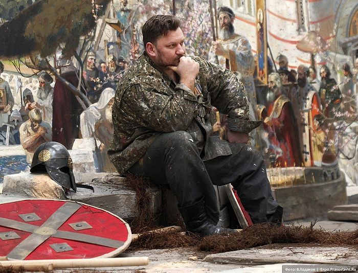 Среди множества фотографий Павла Рыженко на сайте художника есть фото, где он присел рядом со своим творением. Кажется, что это тот воин княжеской дружины вернулся и присел отдохнуть. Духовное единство художника с полотном создает такой потрясающий реалистичный эффект.