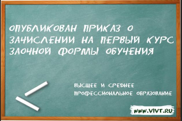 Опубликован приказ о зачислении абитуриентов на 1 курс заочной формы обучения высшего и среднего профессионального образования ВИВТ. Поздравляем всех, кто вступил в ряды студентов ВИВТ! Со всеми приказами о зачислении ВИВТ в 2016 г. можно ознакомиться здесь.