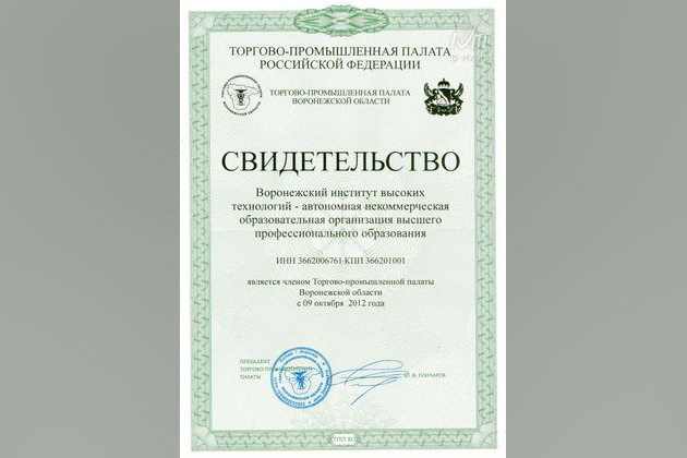 «Воронежский институт высоких технологий – автономная некоммерческая образовательная организация высшего профессионального образования» заседанием президиума правления Палаты принят в члены Торгово-промышленной палаты Воронежской области 9 октября 2012 года.
