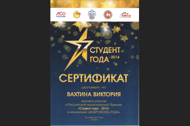Столь значимое и масштабное мероприятие прошло 25 ноября в Казани, куда со всех точек страны собралась лучшая молодежь России. «Казань подарила мне море ярких впечатлений, волшебную атмосферу чарующего города и новых друзей. На площадках царила дружественная поддержка и взаимовыручка, что не может не радовать. Все-таки премии и конкурсы, это не всегда разделение всех участников по отдельным группам и вражда.Отдельно хочется поблагодарить организаторов премии за такую гостеприимную встречу и уровень проведения мероприятий, а так же администрацию нашего ВУЗа, потому что всегда дают возможность участвовать, проявлять себя, и всячески способствуют развитию потенциала студентов ВИВТ».