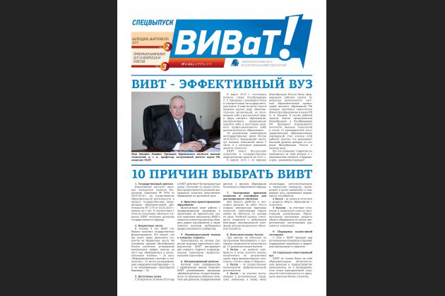 Вышел спецвыпуск газеты «ВИВаТ!», посвященный приемной кампании 2015. В этом номере: календарь абитуриента 2015, приемная кампания 2015 в вопросах и ответах, вопросы эффективности вуза и 10 причин выбрать ВИВТ. Электронная версия выпуска доступна на сайте ВИВТ.