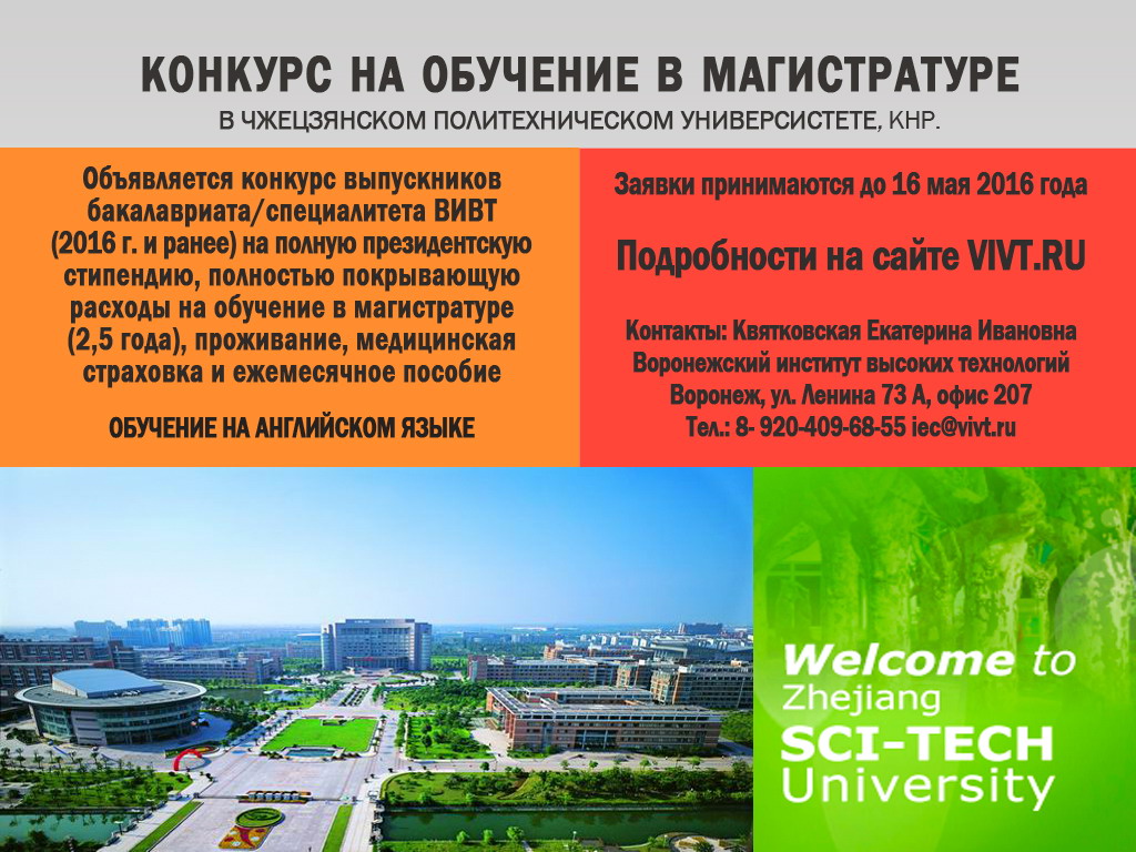 Объявляется конкурс выпускников бакалавриата/специалитета ВИВТ (2016 года и ранее) на полную президентскую стипендию, полностью покрывающую расходы на обучение в магистратуре (2,5 года), проживание, мед.страховка и ежемесячное пособие в Чжэцзянском политехническом университете, КНР. Обучение на английском языке.