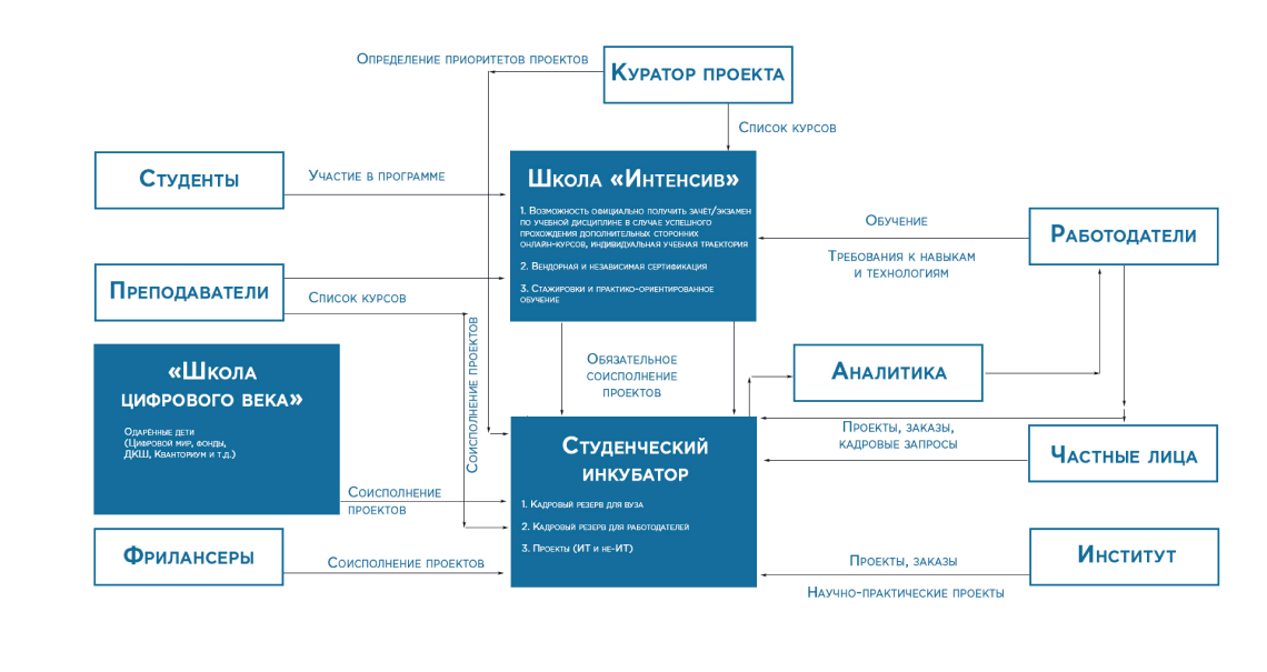 Для формирования требуемых проектных умений и навыков, студентам предлагается индивидуальный набор онлайн-курсов с практической направленностью, международная сертификация вендоров.